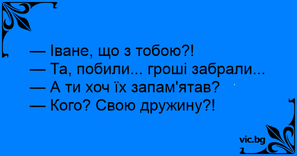 — Іване, що з тобою?! — Та, побили... гроші забрали... — А ти хоч їх запам'ятав? — Кого? Свою дружину?!
