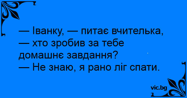 — Іванку, — питає вчителька, — хто зробив за тебе домашнє завдання?