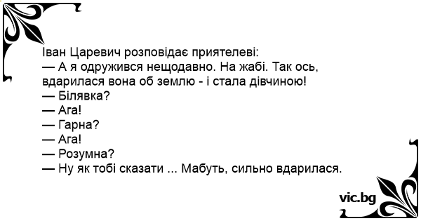 — А я одружився нещодавно. На жабі. Так ось, вдарилася вона об землю - і стала дівчиною!