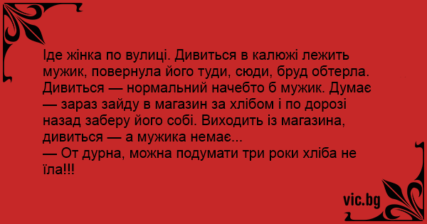 Іде жінка по вулиці. Дивиться в калюжі лежить мужик, повернула його туди, сюди, бруд обтерла. Дивиться — нормальний начебто б мужик. Думає — зараз зайду в магазин за хлібом і по дорозі назад заберу його собі. Виходить із магазина, дивиться — а мужика немає...