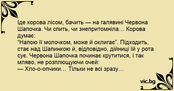Іде корова лісом, бачить — на галявині Червона Шапочка. Чи спить, чи знепритомніла… Корова думає: “Напою її молочком, може й оклигає”. Підходить, стає над Шапинкою й, відповідно, дійниці їй у рота сує. Червона Шапочка починає крутитися, і так мляво, не розплющуючи очей: — Хло-о-опчики… Тільки не всі зразу…