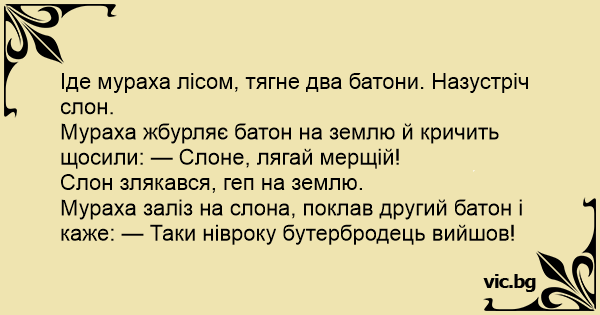 Іде мураха лісом, тягне два батони. Назустріч слон.
