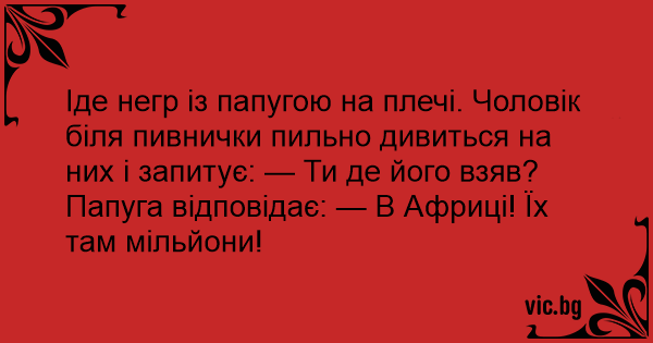 Идет негр с попугаем на плече. Мужик у пивного ларька смотрит напряженно на них и спрашивает: