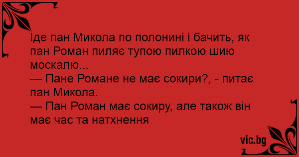 Іде пан Микола по полонині і бачить, як пан Роман пиляє тупою пилкою шию москалю...