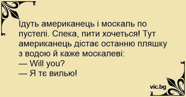 Ідуть американець і москаль по пустелі. Спека, пити хочеться! Тут американець дістає останню пляшку з водою й каже москалеві: