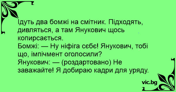 Ідуть два бомжі на смітник. Підходять, дивляться, а там Янукович щось копирсається.