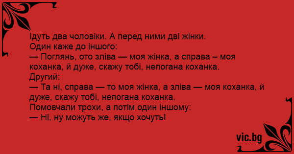 — Та ні, справа — то моя жінка, а зліва — моя коханка, й дуже, скажу тобі, непогана коханка.