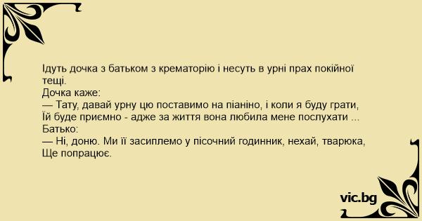 Ідуть дочка з батьком з крематорію і несуть в урні прах покійної тещі.
