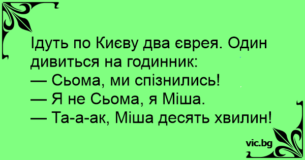 Ідуть по Києву два єврея. Один дивиться на годинник: