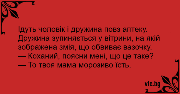 Ідуть чоловік і дружина повз аптеку. Дружина зупиняється у вітрини, на якій зображена змія, що обвиває вазочку.