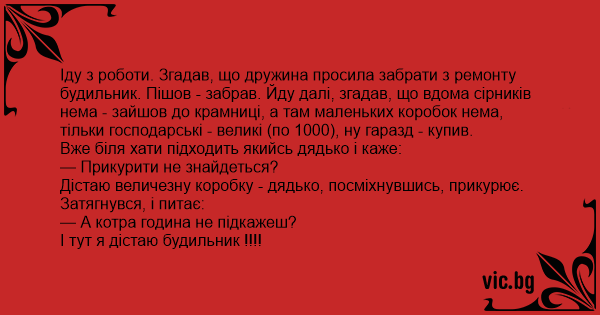 Іду з роботи. Згадав, що дружина просила забрати з ремонту будильник. Пішов - забрав. Йду далі, згадав, що вдома сірників нема - зайшов до крамниці, а там маленьких коробок нема, тільки господарські - великі (по 1000), ну гаразд - купив.