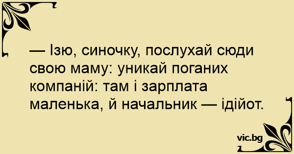 — Ізю, синочку, послухай сюди свою маму: уникай поганих компаній: там і зарплата маленька, й начальник — ідійот.