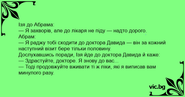 Ізя до Абрама: — Я захворів, але до лікаря не піду — надто дорого. Абрам: — Я раджу тобі сходити до доктора Давида — він за кожний наступний візит бере тільки половину. Дослухавшись поради, Ізя йде до доктора Давида й каже: — Здрастуйте, докторе. Я знову до вас... — Тоді продовжуйте вживати ті ж ліки, які я виписав вам минулого разу.