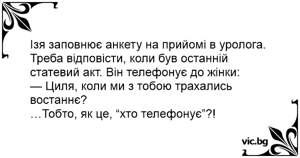 Ізя заповнює анкету на прийомі в уролога. Треба відповісти, коли був останній статевий акт. Він телефонує до жінки: