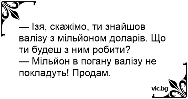 — Ізя, скажімо, ти знайшов валізу з мільйоном доларів. Що ти будеш з ним робити?
