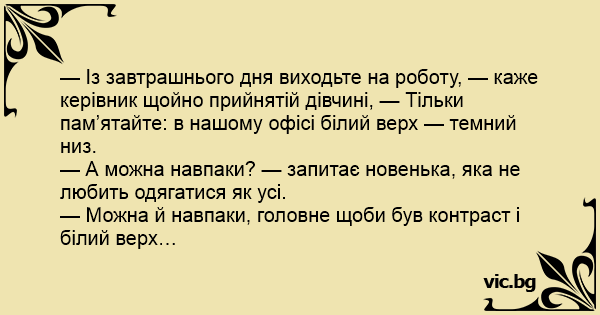 — Із завтрашнього дня виходьте на роботу, — каже керівник щойно прийнятій дівчині, — Тільки пам’ятайте: в нашому офісі білий верх — темний низ.