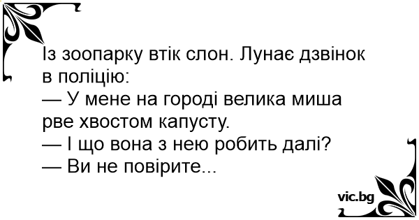 Із зоопарку втік слон. Дзвінок до кабінету шерифа: - Пане шериф! На моєму полі стоїть величезний сірий пацюк! Він зриває хвостом капусту. - І що з нею робить? - Сер! Ви не повірите...