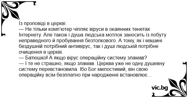 — Не тільки комп’ютер чіпляє віруси в окаянних тенетах Інтернету. Але також і душа людська мотлох заносить із побуту неправедного й пробування безтолкового. А тому, як і машині бездушній потрібний антивірус, так і душі людській потрібне очищення в церкві.