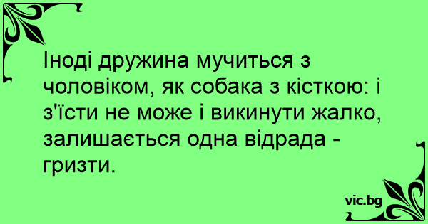 Іноді дружина мучиться з чоловіком, як собака з кісткою: і з'їсти не може і викинути жалко, залишається одна відрада - гризти.