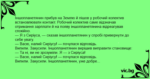 Випили. Закусили. Іншопланетянин, уже добре захмелівши, плутаючи язиком, проказав: