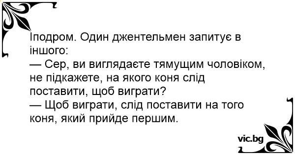Іподром. Один джентельмен запитує в іншого: — Сер, ви виглядаєте тямущим чоловіком, не підкажете, на якого коня слід поставити, щоб виграти? — Щоб виграти, слід поставити на того коня, який прийде першим.