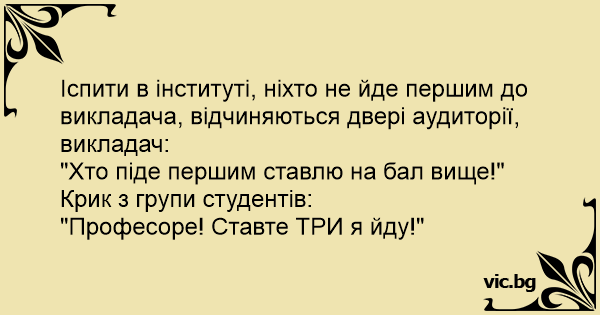Іспити в інституті, ніхто не йде першим до викладача, відчиняються двері аудиторії, викладач: