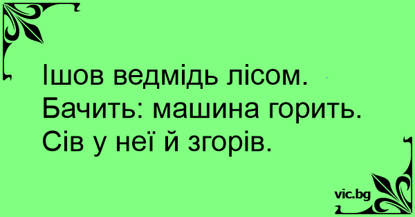Ішов ведмідь лісом. Бачить: машина горить. Сів у неї й згорів.