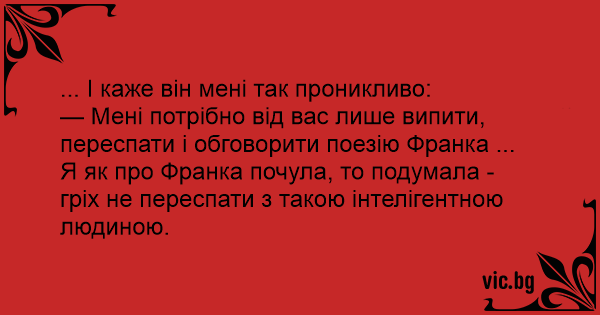 — Мені потрібно від вас лише випити, переспати і обговорити поезію Франка ...