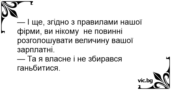 — І ще, згідно з правилами нашої фірми, ви нікому не повинні розголошувати величину вашої зарплатні. — Та я власне і не збирався ганьбитися.
