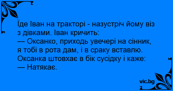 — Оксанко, приходь увечері на сінник, я тобі в рота дам, і в сраку вставлю.