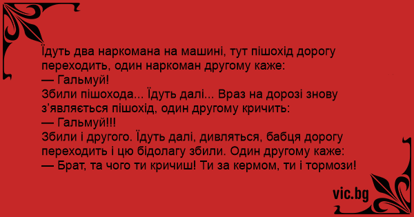 Їдуть два наркомана на машині, тут пішохід дорогу переходить, один наркоман другому каже: