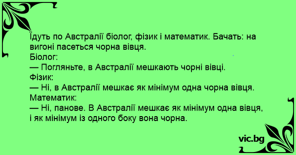 — Ні, панове. В Австралії мешкає як мінімум одна вівця, і як мінімум із одного боку вона чорна.