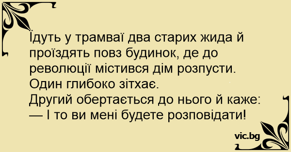 Їдуть у трамваї два старих жида й проїздять повз будинок, де до революції містився дім розпусти. Один глибоко зітхає.