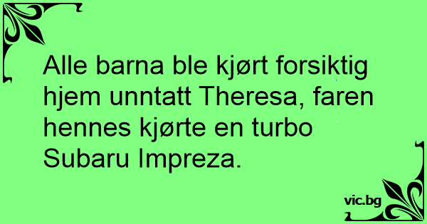 Alle barna ble kjørt forsiktig hjem unntatt Theresa, faren hennes kjørte en turbo Subaru Impreza.