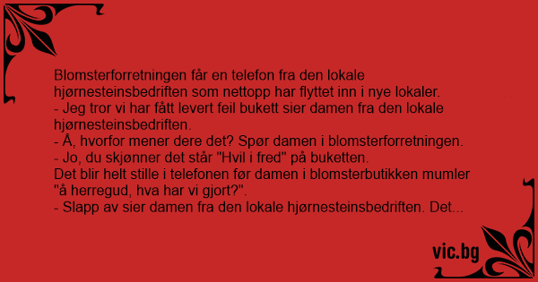 - Neida, jeg er ikke så bekymret for deres tilfelle. Problemet er at buketten som skulle leveres til dere er sendt til en begravelse med teksten "lykke til med ønske mange gode år i nye lokaler".