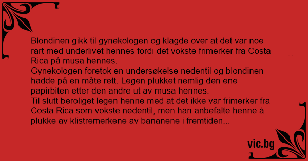 Til slutt beroliget legen henne med at det ikke var frimerker fra Costa Rica som vokste nedentil, men han anbefalte henne å plukke av klistremerkene av bananene i fremtiden...