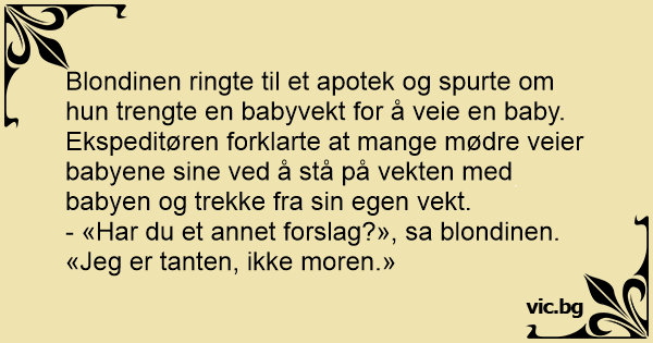 Blondinen ringte til et apotek og spurte om hun trengte en babyvekt for å veie en baby. Ekspeditøren forklarte at mange mødre veier babyene sine ved å stå på vekten med babyen og trekke fra sin egen vekt.