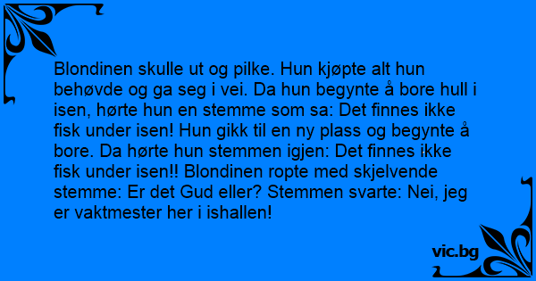 Blondinen skulle ut og pilke. Нun kjøpte alt hun behøvde og ga seg i vei. Da hun begynte å bore hull i isen, hørte hun en stemme som sa: Det finnes ikke fisk under isen! Нun gikk til en ny plass og begynte å bore. Da hørte hun stemmen igjen: Det finnes ikke fisk under isen!! Blondinen ropte med skjelvende stemme: Er det Gud eller? Stemmen svarte: Nei, jeg er vaktmester her i ishallen!