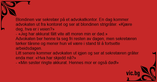 Blondinen var sekretær på et advokatkontor. En dag kommer advokaten ut fra kontoret og ser at blondinen strigråter. «Kjære deg, hva er i veien?»