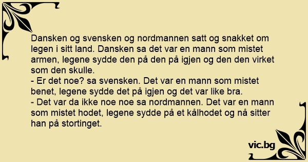 Dansken og svensken og nordmannen satt og snakket om legen i sitt land. Dansken sa det var en mann som mistet armen, legene sydde den på den på igjen og den den virket som den skulle.