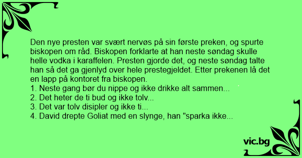 Den nye presten var svært nervøs på sin første preken, og spurte biskopen om råd. Biskopen forklarte at han neste søndag skulle helle vоdка i karaffelen. Presten gjorde det, og neste søndag talte han så det ga gjenlyd over hele prestegjeldet. Etter prekenen lå det en lapp på kontoret fra biskopen.