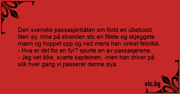 Den svenske passasjerbåten om forbi en ubebodd, liten øy. Inne på stranden sto en fillete og skjeggete mann og hoppet opp og ned mens han vinket febrilsk.