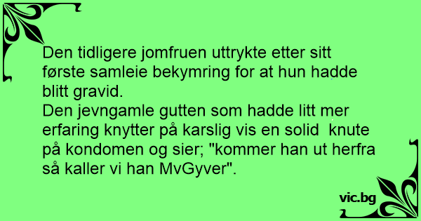 Den jevngamle gutten som hadde litt mer erfaring knytter på karslig vis en solid  knute på kondomen og sier; "kommer han ut herfra så kaller vi han MvGyver".