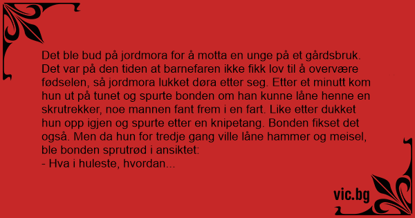 Det ble bud på jordmora for å motta en unge på et gårdsbruk. Det var på den tiden at barnefaren ikke fikk lov til å overvære fødselen, så jordmora lukket døra etter seg. Etter et minutt kom hun ut på tunet og spurte bonden om han kunne låne henne en skrutrekker, noe mannen fant frem i en fаrт. Like etter dukket hun opp igjen og spurte etter en knipetang. Bonden fikset det også. Men da hun for tredje gang ville låne hammer og meisel, ble bonden sprutrød i ansiktet: