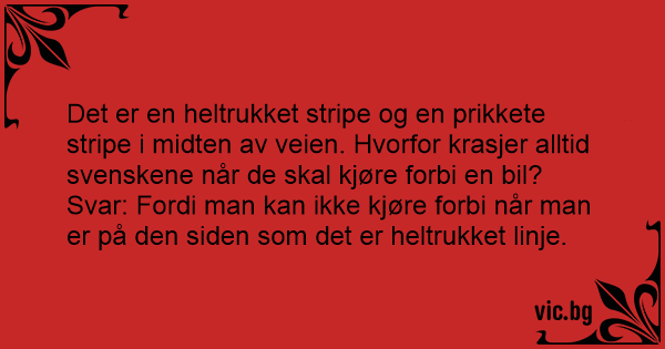 Det er en heltrukket stripe og en prikkete stripe i midten av veien. Hvorfor krasjer alltid svenskene når de skal kjøre forbi en bil?