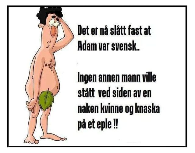 Det er na slätt fast at Adam var svensk... Ingen annen mann ville stätt ved siden av en	naken kvinne og knaska	pả et eple !!