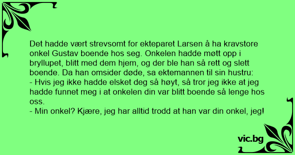 Det hadde vært strevsomt for ekteparet Larsen å ha kravstore onkel Gustav boende hos seg. Onkelen hadde møtt opp i bryllupet, blitt med dem hjem, og der ble han så rett og slett boende. Da han omsider døde, sa ektemannen til sin hustru: