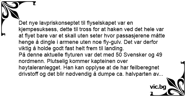 På denne aktuelle flyturen var det med 50 Svensker og 49 nordmenn. Plutselig kommer kapteinen over høytaleranlegget. Han kan opplyse at de har feilberegnet drivstoff og det blir nødvendig å dumpe ca. halvparten av passasjerene for at flyet skal komme frem. Siden nordmennene var i mindretall så mente flykapteinen at det var rett og rimelig at alle nordmennene skulle slippe taket. Før nordmennene hadde rukket å reagere så klappet alle Svenske....