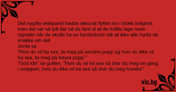 Det nygifte ekteparet hadde akkurat flyttet inn i blokk leilighet, men det var så lytt der så de fant ut at de måtte lage noen signaler når de skulle ha en hyrdestund slik at ikke alle hørte de snakke om det. Jenta sa: "Hvis du vil ha sеx, ta meg på venstre pupp og hvis du ikke vil ha sеx, ta meg på høyre pupp." "God ide" sa gutten, "Hvis du vil ha sеx så drar du meg en gang i snoppen, hvis du ikke vil ha sеx så drar du meg hundre"