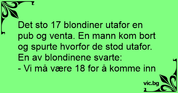 - Det stod sjutton blondiner utanför en pub. Vet du vad de väntade på? - Nej. - Den sista. Man måste vara arton för att få komma in.